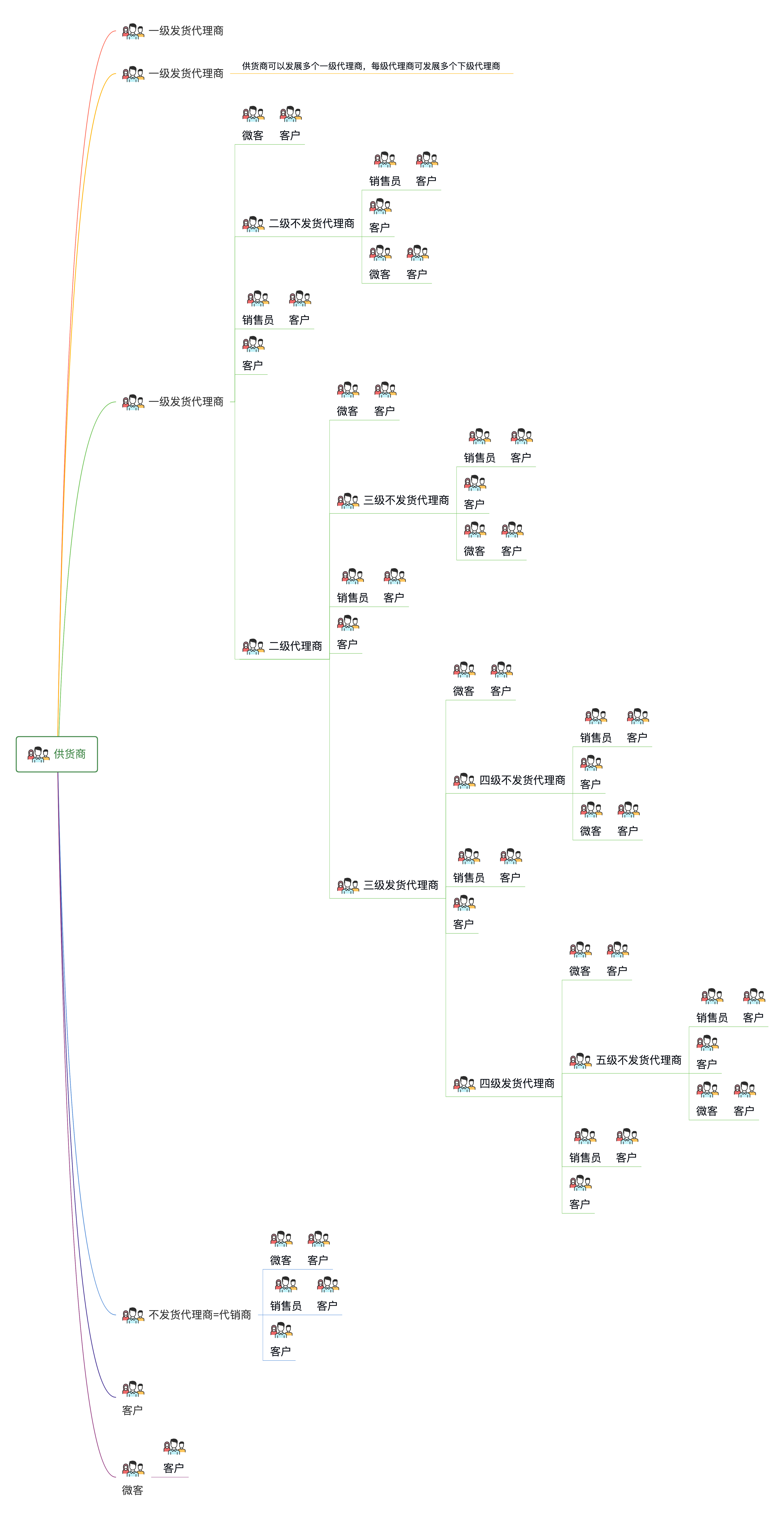 第五级只能是不发货的分销商。供货商可以发展:发货分销商、不发货分销商、微客、粉丝