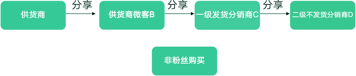 第五级只能是不发货的分销商。供货商可以发展:发货分销商、不发货分销商、微客、粉丝